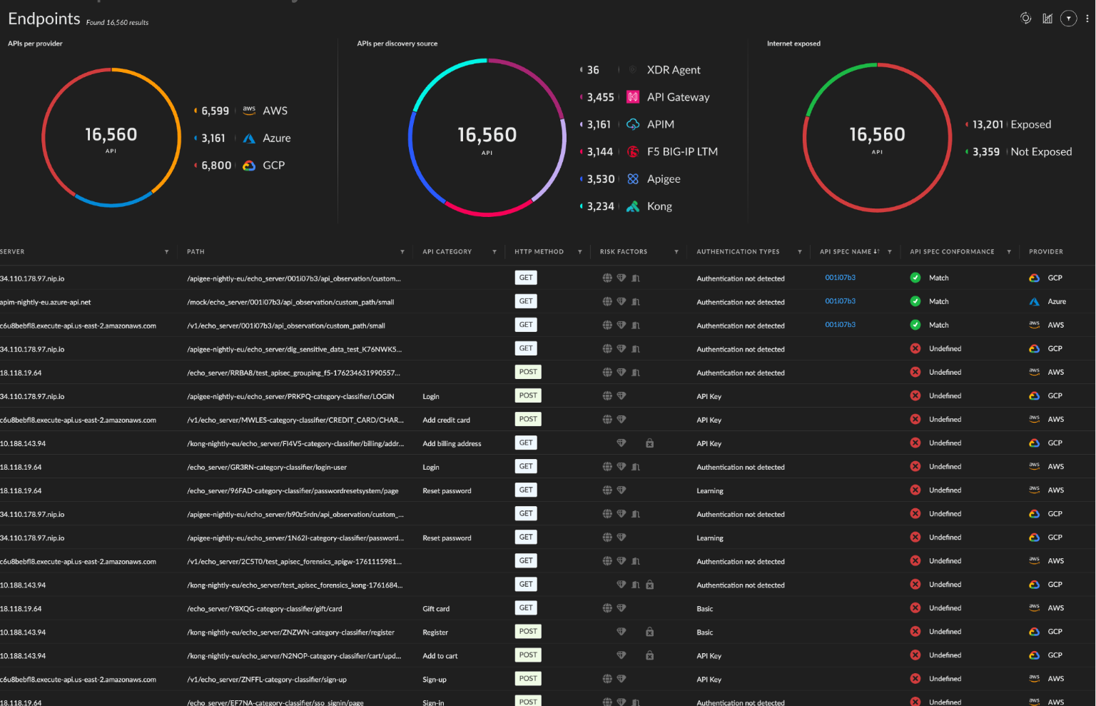 Obtenga una visibilidad completa de todo su panorama de API para eliminar los puntos ciegos. Descubra y valide automáticamente las API en puertas de enlace, cargas de trabajo y entornos de nube. Descubra las API en la sombra, zombi y no gestionadas para obtener visibilidad y control totales.