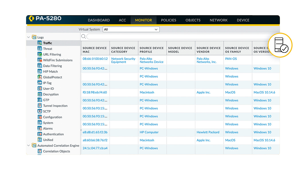 Device-ID™, una función de PAN-OS, proporciona reglas de políticas para dispositivos independientemente de los cambios que se produzcan en la dirección IP o la ubicación. Obtenga información contextual sobre el modo en que se relacionan los eventos con los dispositivos y las políticas de los dispositivos. PAN-OS ayuda a mejorar las políticas de seguridad, descifrado, calidad del servicio (QoS, por sus siglas en inglés) y autenticación.
