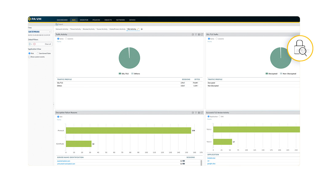 Si no se inspecciona, el tráfico cifrado no permite a las organizaciones ver los riesgos de seguridad que se ocultan en su interior. Los hackers pueden aprovechar esta falta de visibilidad para distribuir malware dentro del tráfico cifrado. PAN-OS proporciona descifrado exhaustivo para el tráfico cifrado TLS y SSL, incluido el TLS 1.3 y el HTTP/2.