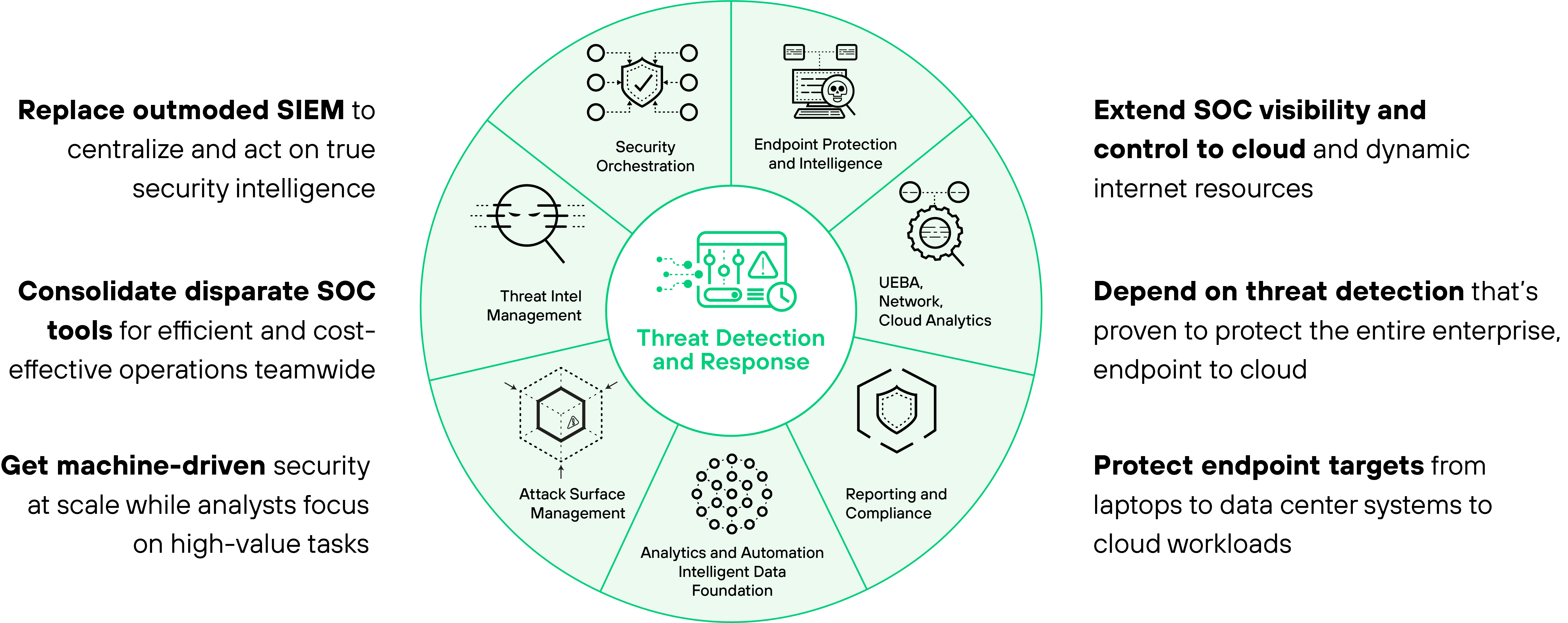 A diferencia de lo que pasa con las operaciones de seguridad tradicionales, el SOC moderno se basa en la aplicación de la ciencia de datos a conjuntos de datos masivos, y no en las decisiones que toman las personas ni en reglas que se concibieron para detener las amenazas del pasado.