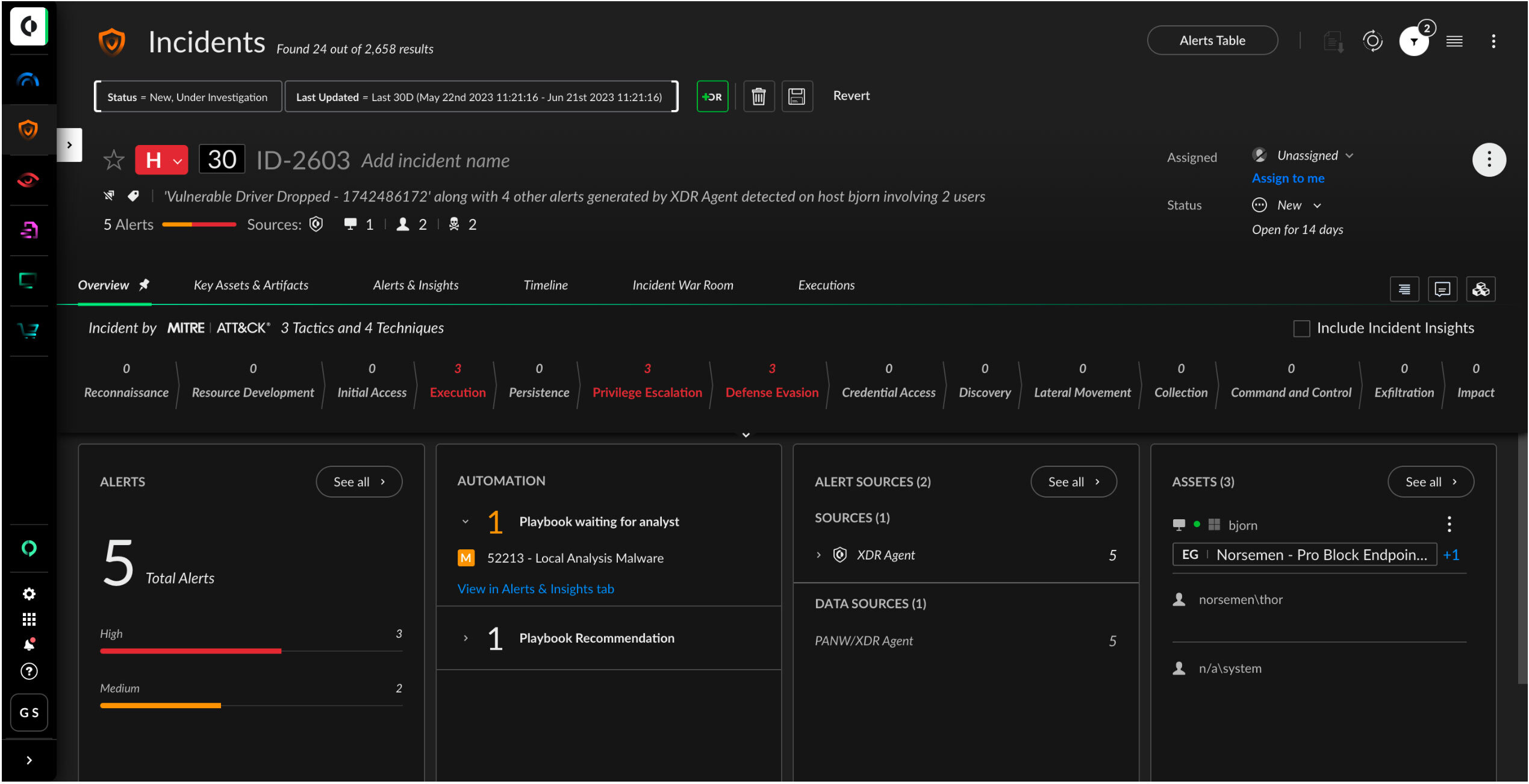Figura 6: Obtenga un contexto más detallado sobre los incidentes gracias a la identificación según el marco de MITRE ATT&CK, las alertas asociadas, el estado del libro de estrategias, las fuentes de alerta y los artefactos